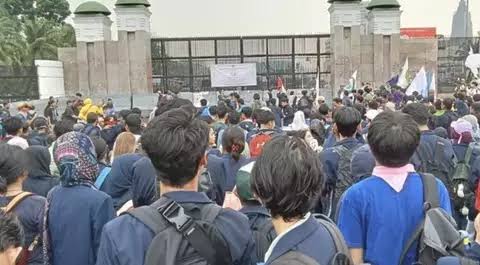 Jakarta – Badan Eksekutif Mahasiswa Universitas Padjadjaran (BEM Unpad) berunjuk rasa di depan gerbang DPR RI, Jalan Gatot Soebroto, Jakarta, pada Jumat 5 September 2025.
