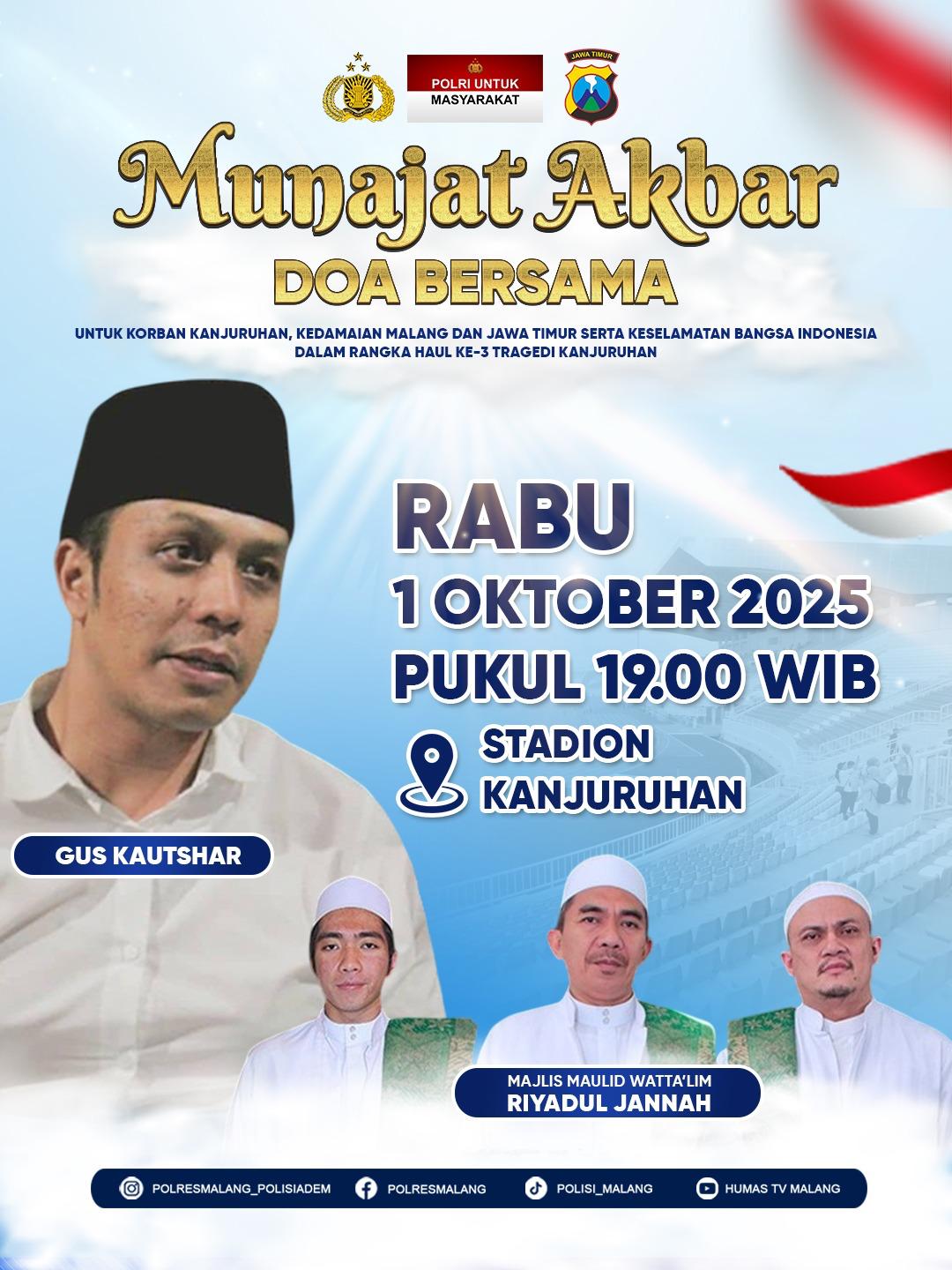 Munajat Akbar yang dimulai pukul 19.00 WIB akan menghadirkan penceramah kondang Gus Kautshar dan dipimpin langsung oleh Majelis Riyadlul Jannah. Ribuan jamaah diperkirakan akan hadir untuk melantunkan doa, memohon ampunan bagi para korban, kedamaian bagi Malang dan Jawa Timur, serta keselamatan untuk bangsa Indonesia.