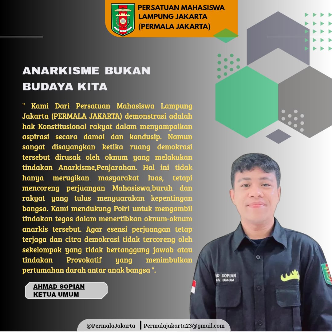 Jakarta – Situasi keamanan dalam negeri beberapa hari ini dinilai semakin mencekam akibat ulah provokator yang tidak bertanggung jawab. Menanggapi hal tersebut, Ahmad Sopian selaku Ketua Umum Persatuan Mahasiswa Lampung Jakarta (Ketua Umum Permala Jakarta) menegaskan bahwa aksi yang dilakukan masyarakat merupakan bagian dari keresahan seluruh masyarakat indonesia dan setiap warga negara mempunyai hak untuk menyampaikan pendapat dimuka umum hal tersebut di lindungi dalam Undang-Undang Dasar 1998 tentang Menyampaikan pendapat dimuka umum, Sabtu 30 Agustus 2025.