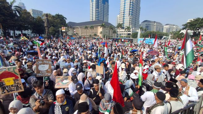 JAKARTA – Ribuan warga mengikuti aksi bela Palestina bertajuk “Indonesia Melawan Genosida” yang digelar di kawasan Patung Kuda, Jakarta Pusat pada Minggu.