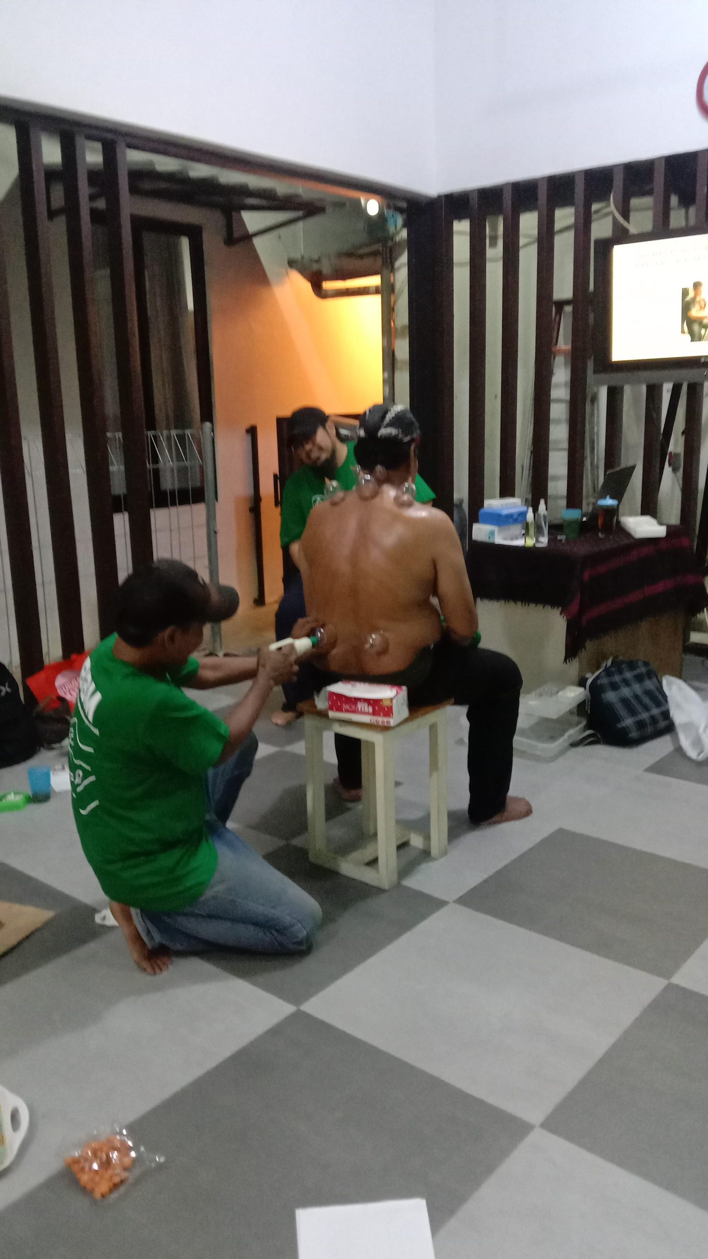Keceriaan dan rasa ingin tahu warga membuat suasana pelatihan semakin hidup. Warga tampak bersemangat mempraktekkan langkah-langkah bekam, didampingi langsung oleh instruktur.