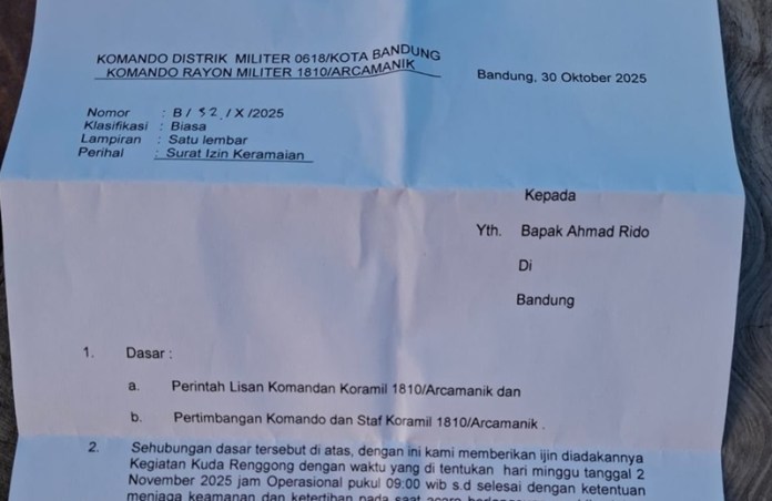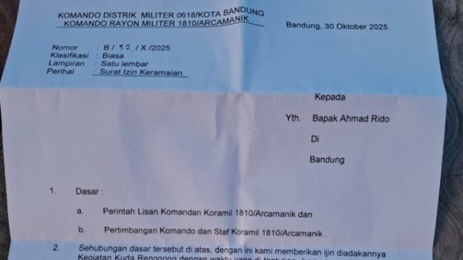 Jakarta – Mantan Menko Polhukam Mahfud MD mempertanyakan surat keramaian atau izin hiburan masyarakat yang dikeluarkan oleh TNI. Mahfud mengunggah sepucuk surat izin keramaian yang dikeluarkan Koramil 1810/Arcamanik Kodim 0618/Kota Bandung melalui media sosial (medsos) X atau Twitter miliknya.