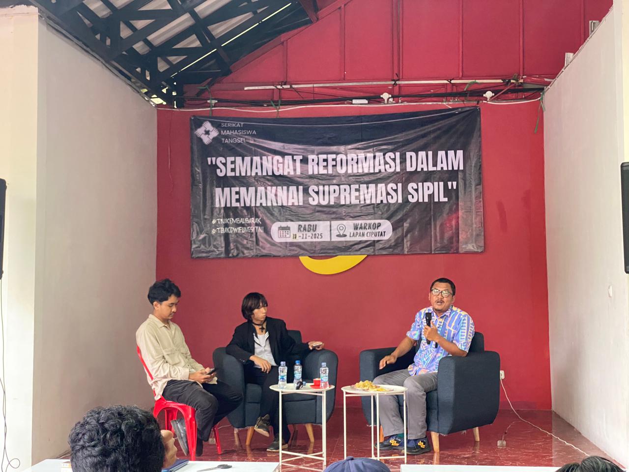 TANGSEL – Serikat Mahasiswa Tangerang Selatan menggelar diskusi publik bertema “Semangat Reformasi dalam Memaknai Supremasi Sipil” pada Rabu (19 Oktober 2025), di Warkop Lapan, Ciputat, Tangerang Selatan.
